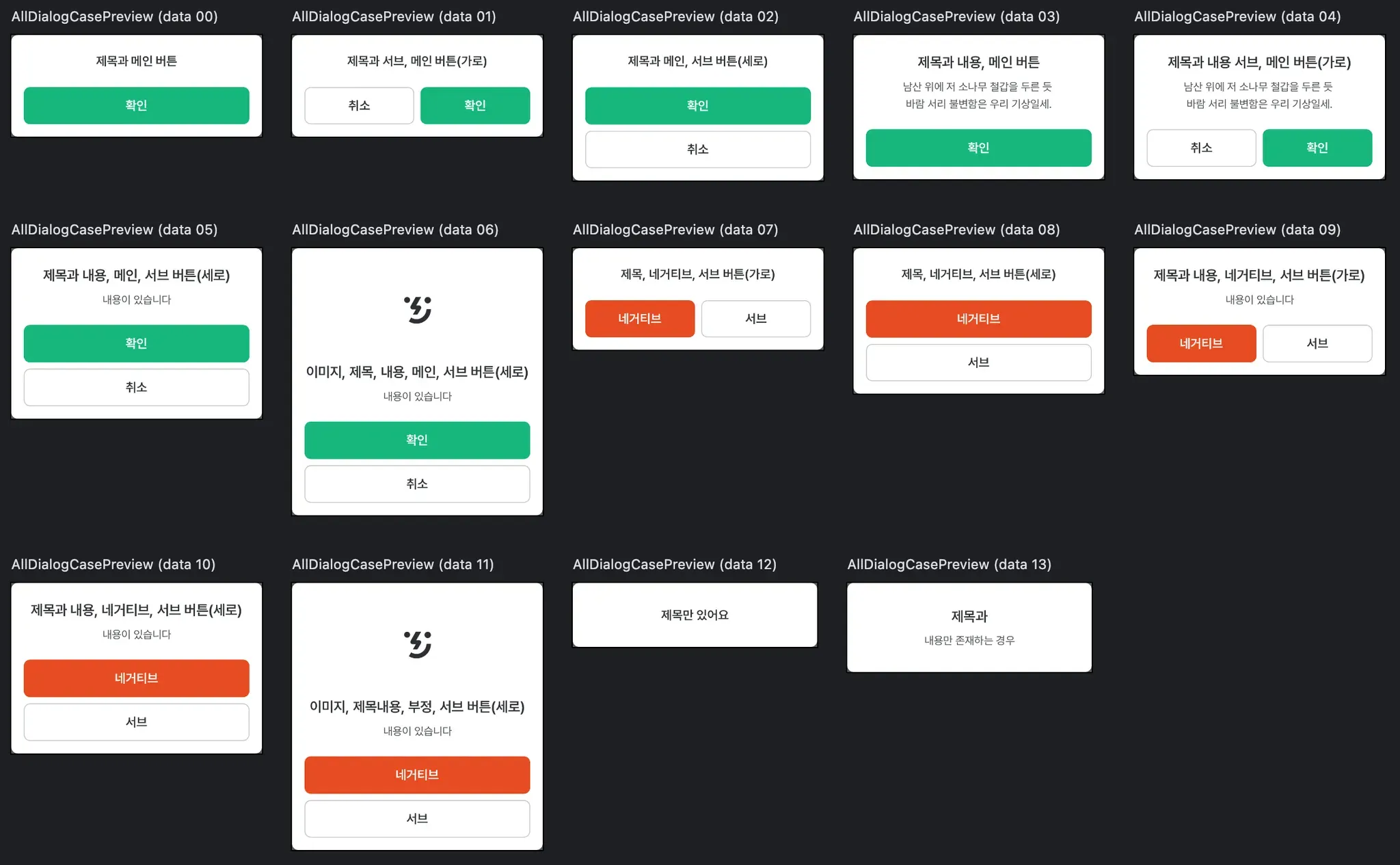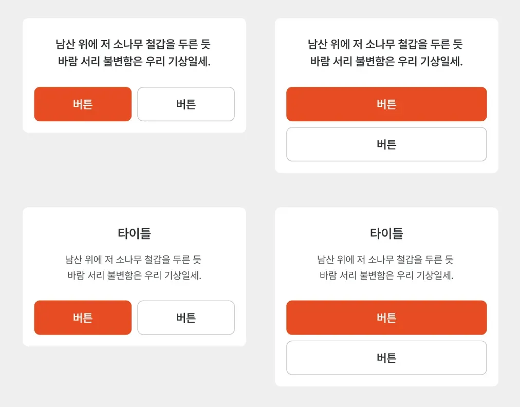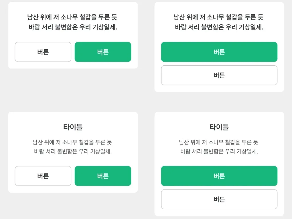 많은 개발자들은 미래에 일어날 일을 알기 어려워 확장성을 잘 생각하지 않는다. 위와 같이 네거티브 버튼과 서브 버튼이 존재하는 케이스가 추가되었다. 심지어 이 경우에는 가로 정렬일 때 서브 버튼은 오른쪽에 위치한다. (메인 버튼이 존재했던 경우에는 왼쪽에 있었다.) 또, 제목 상단에 이미지가 추가되는 케이스도 존재한다. 버튼이 아예 존재하지 않거나, 제목만 존재하는 케이스도 있다. 이렇게 되면 총 14가지의 케이스가 존재하게 된다.