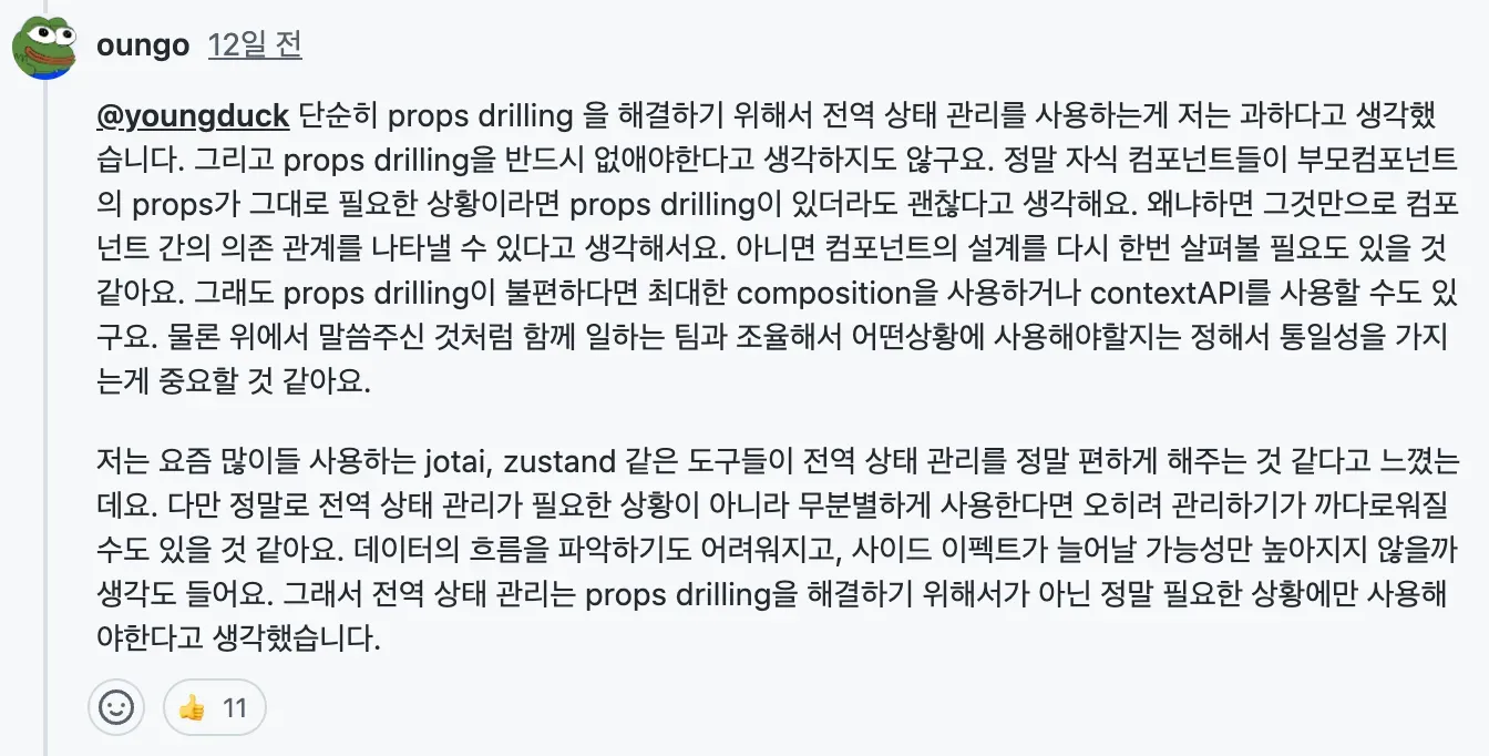 이와 관련해 최근 주목받고 있는 토스의 지침서 속에서 Props Drilling에 관련한 토론이 있었다.