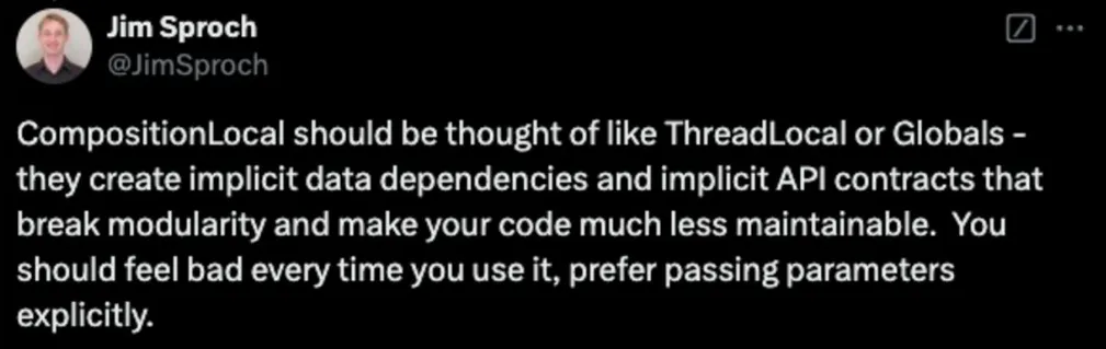 Compose를 만드신 개발자도 CompositionLocal을 사용하면 모듈 의존성을 깨고 코드의 유지보수성을 낮출 수 있다고 언급한다. 이에 대해 Props Drilling을 항상 제거하는 것이 정답이 아니고 팀과의 적절한 소통을 통해서 통일성을 지키면서 명시적인 전달이 필요할 경우에 적절히 사용해야 한다고 생각한다.