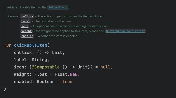 overflowIndicator를 사용해서 화면에 모든 버튼이 표시될 수 없을 때 추가 버튼이 있음을 나타내는 메뉴 버튼을 생성한다.menuState를 사용해서 오버플로우의 상태를 관리한다.ButtonGroupScope가 지원하는clickableItem()함수로 동적으로 버튼을 생성한다.