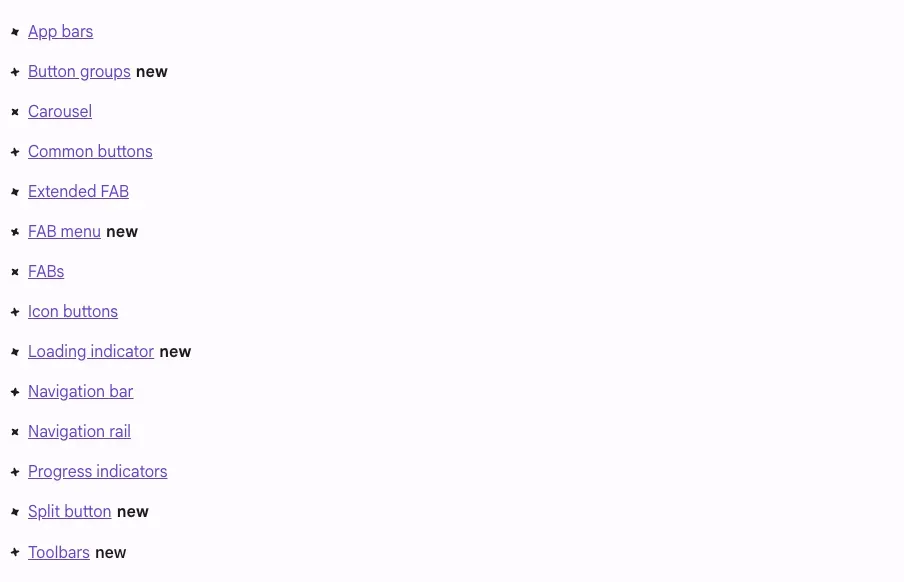 이번 글에서는 신규 업데이트된 컴포넌트를 위주로 다룰 예정이며, Material3 Design kit과 공식문서의 예시 코드를 기반으로 직접 구현해본 코드를 통해 사용법과 주요 특징을 설명해보겠다. 이 업데이트로 Deprecated되는 컴포넌트들이 몇 가지 있으니 주의해서 읽어보면 좋을 것 같다.