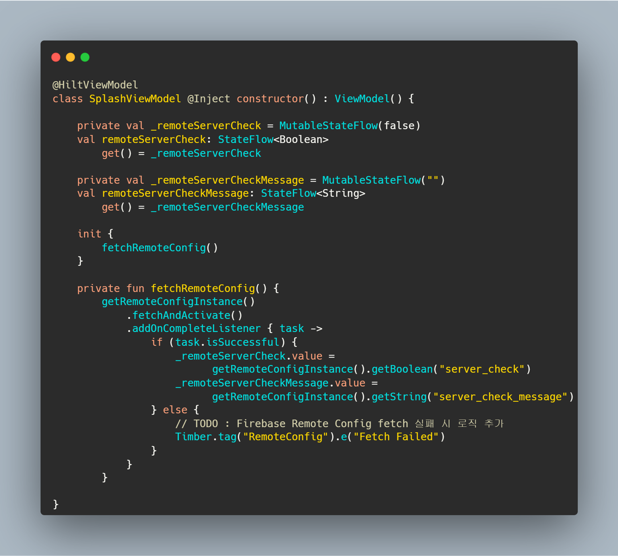 싱글톤으로 생성했던 remote config 객체에서 fetchAndActivate() 함수를 통해 서버에서 설정을 가져오고 활성화하였다. addOnCompleteListener를 사용해 비동기 작업이 완료되었을 때의 콜백을 추가하였다. 만약 작업이 성공적으로 완료되면, Firebase remote config에서 발행한 매개변수 값들을 앞서 생성한 MutableStateFlow 변수들에 저장한다.