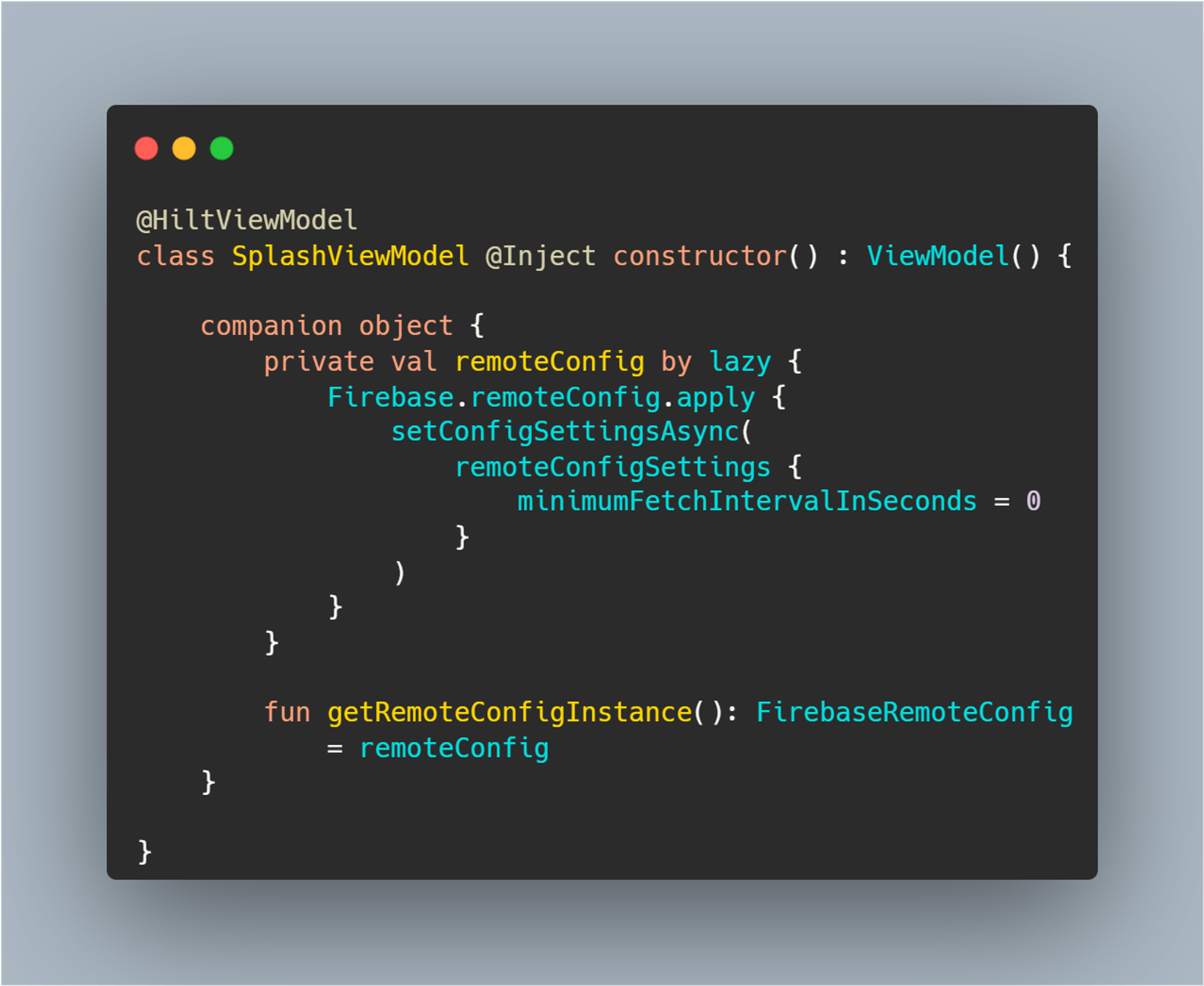 이제 Firebase remote config에서 원하는 값을 가져올 수 있게 객체를 생성해야 한다. 해당 객체는 싱글톤으로 생성해야 하므로 (앱 전역으로 일관된 값을 가져오기 위함, 성능 저하 방지) 코틀린의 companion object를 통해 객체를 생성하였다.