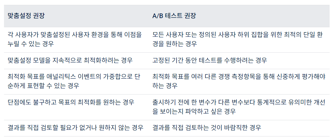 성능이 가장 뛰어난 단일 사용자 환경을 찾도록 설계된 A/B 테스트와 달리 맞춤설정에서는 각 사용자를 위한 최적의 사용자 환경을 동적으로 선택하여 목표의 극대화를 시도한다. 대부분의 문제 유형에 맞춤설정을 사용하면 최상의 결과를 얻을 수 있지만 다음과 같은 사례에는 A/B 테스트를 사용하는게 좋다고 한다.
