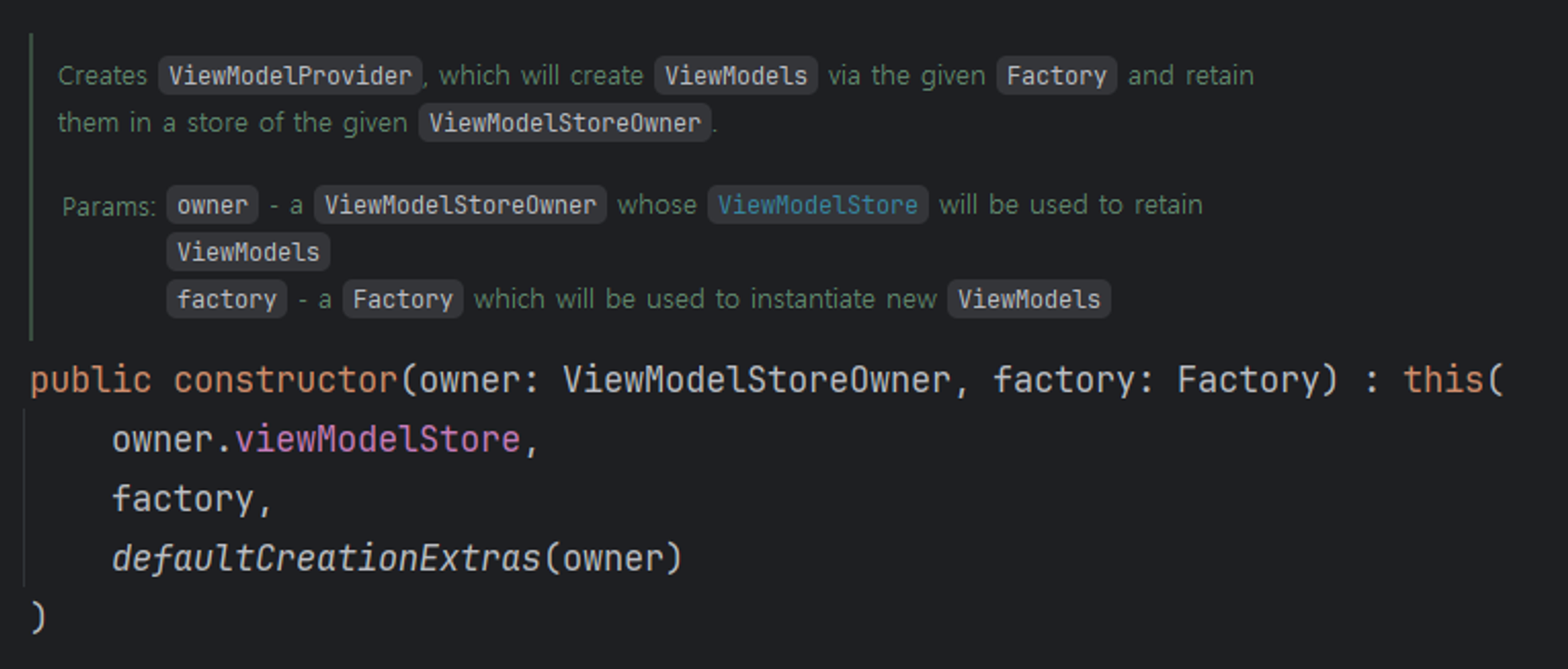 ViewModelStoreOwner는 인터페이스로,ViewModelStore를 반환하는 한 가지 메서드만을 가진다. 기본적으로, 액티비티와 프래그먼트는ViewModelStoreOwner이며, 이는 안드로이드 SDK의ComponentActivity와Fragment클래스가 이 인터페이스를 구현하고 있기 때문이다.Factory:
