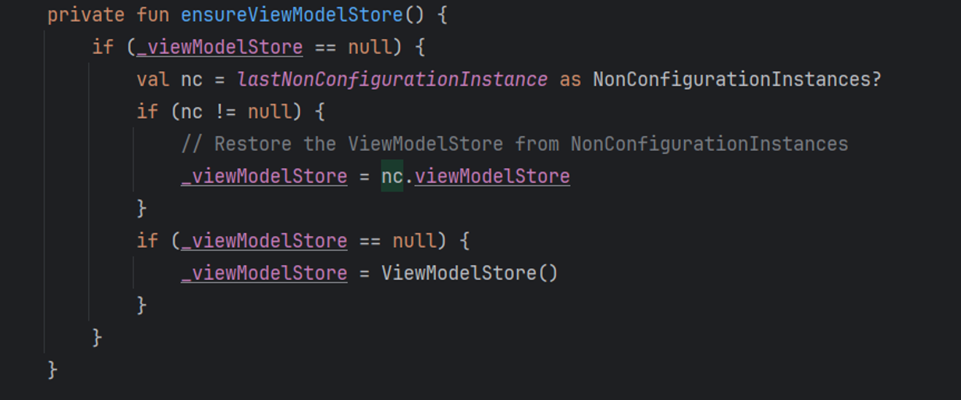 ViewModelStore가null인 경우, 먼저NonConfigurationInstance에서 이전 액티비티의ViewModelStore를 가져온다.만약 액티비티가 처음 생성되는 경우에는 항상 새로운