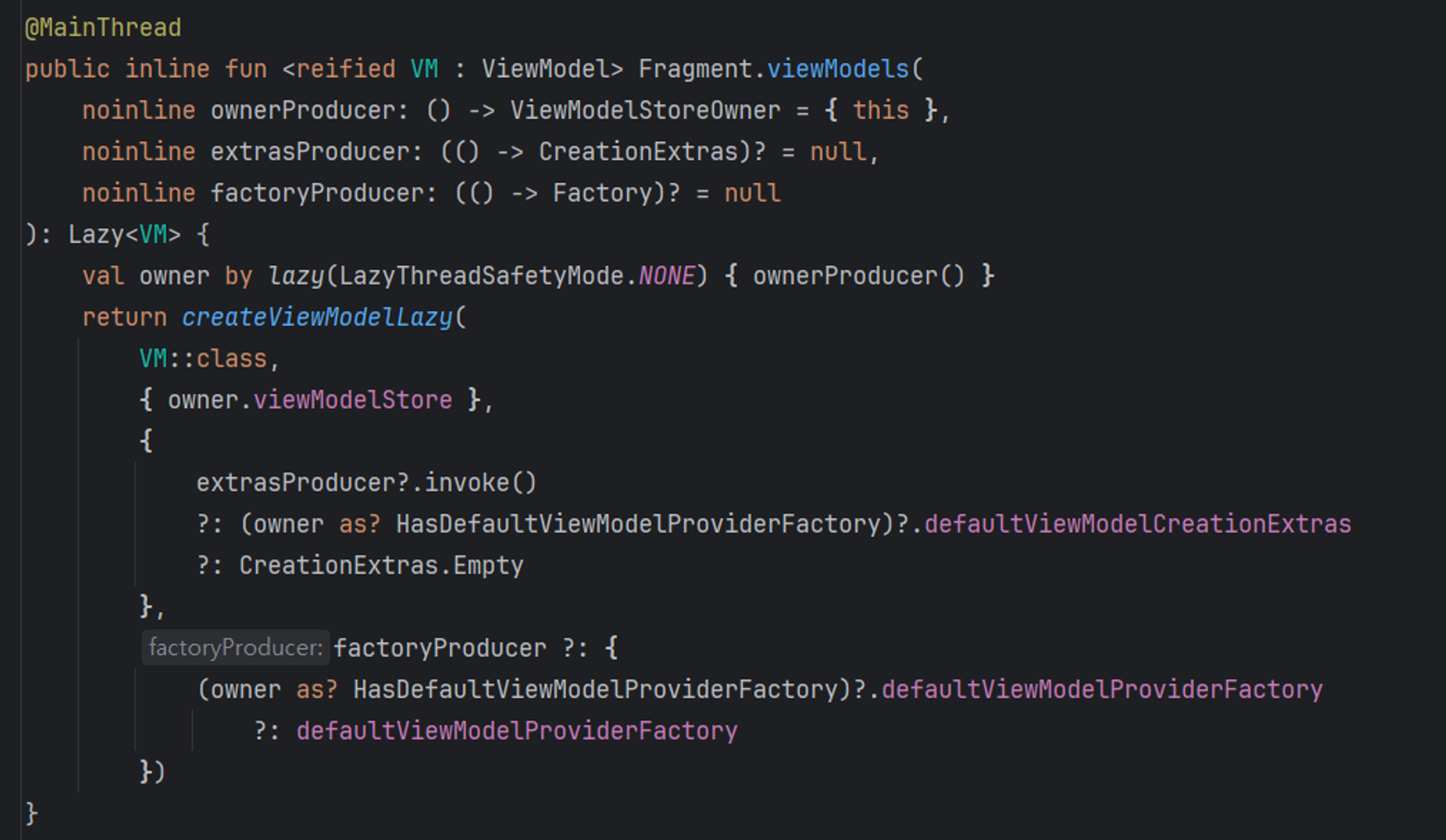 viewModels는 기본적으로Lazy를 반환하여,ViewModel에 최초로 접근할 때ViewModel인스턴스가 생성되고, 이후에는 동일한 인스턴스를 반환하게 된다.ownerProducer(기본값:this)ownerProducer는ViewModelStoreOwner를 제공하는 함수이다. 기본적으로 현재Fragment를ViewModelStoreOwner로 사용한다.이 매개변수를 사용하여