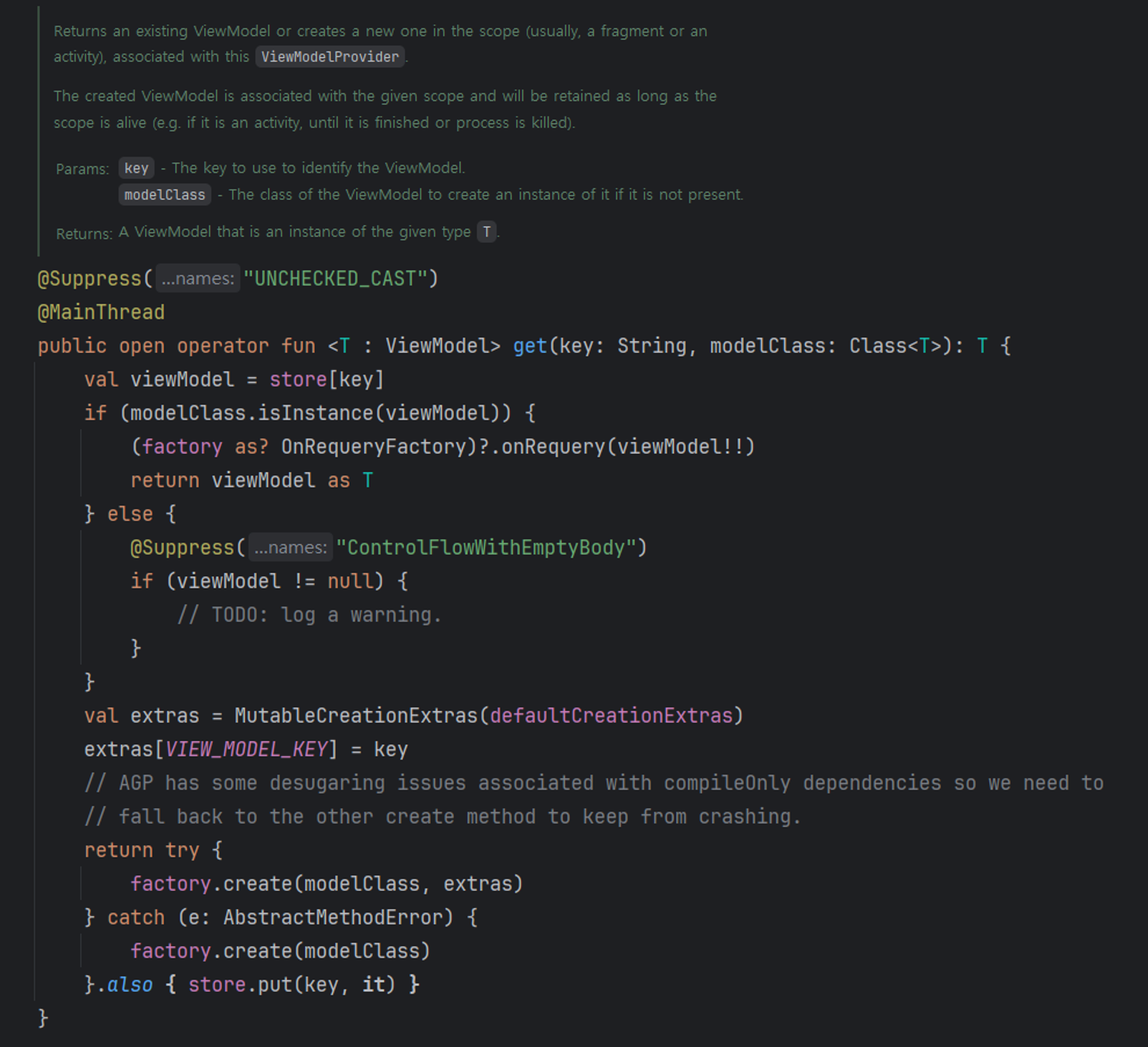이 함수는 먼저 ViewModelStore에서 ViewModel 인스턴스를 찾는다. 만약 ViewModel 인스턴스가 존재하면 해당 인스턴스를 반환하고, 존재하지 않으면 팩토리를 사용해 새 인스턴스를 생성한 뒤 이를 ViewModelStore에 저장하고 반환한다.