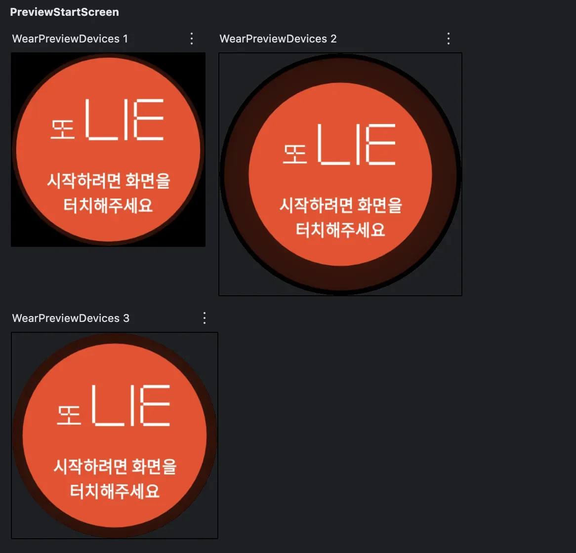 필자의 워치는 위 이미지에서 WearPreviewDevices 2에 해당되어서, 베젤의 크기를 반영하면 원래 의도했던 디자인이 보이게 되었다. 필자의 기기로 발표 중 시연을 진행했기에 문제 없이 진행하였고, 필자가 판단하기엔 꽤 반응이 좋았다.